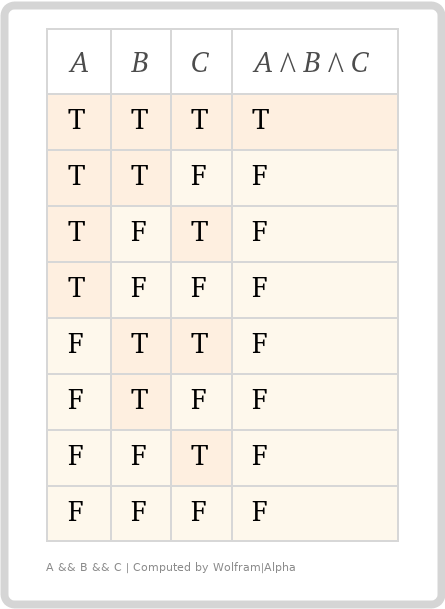 看起来“大部分”是正确的,但请注意,如果所有断言都是 true,那么最终断言也为 `true`!这不是我们想要的结果,但这是数学上正确的结果。因此,我们必须扩展逻辑定义以包含“... 且 NOT(A && B && C)”。我们最终的真值表如下所示。