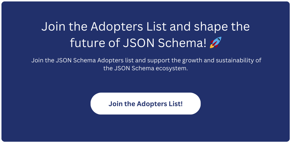 当您浏览采用者列表时,您将发现组织如何在生产环境中使用 JSON Schema。它是获取灵感和学习的宝贵资源。无论您是寻求增强项目的见解,还是希望了解 JSON Schema 生态系统中的最新趋势,采用者列表都为社区中的最佳实践提供了一个窗口。