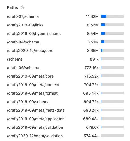 对于 draft-07,路径 /draft-07/schema 被访问了 1166 万次。下一个最大的是 1.8k,是发行说明……就像网站上的 HTML 文件一样(哦,看,那里也有个网站!)。